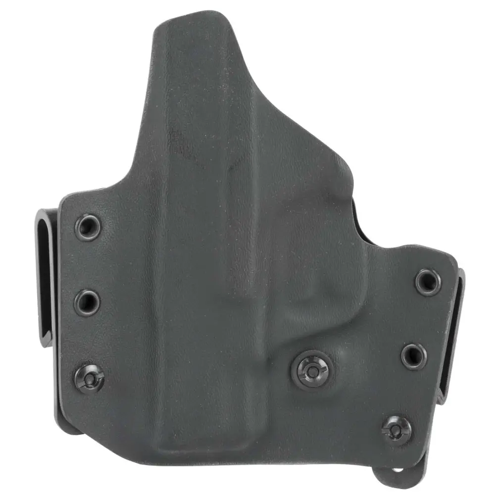 L.A.G. Tactical custom Kydex holster is designed to meet each individual shooter's preference. The holster is extremely comfortable and designed to keep the gun close to the body, making it easy to conceal carry mid to full size gun in a t-shirt without printing. All of Kydex holsters come standard with both IWB and OWB (inside and outside the waistband) belt loops. This allows you to go from concealed to open carry in minutes with one holster. The Defender features easily adjustable retention and is designed to be so comfortable and lightweight. The easily interchangeable belt loops take you seamlessly from your outside the waistband range set up, to your highly concealable inside the waistband daily carry in no time at all. This model is compatible with Smith & Wesson Shield.