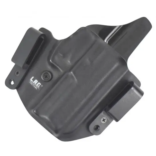 L.A.G. Tactical custom Kydex holster is designed to meet each individual shooter's preference. The holster is extremely comfortable and designed to keep the gun close to the body, making it easy to conceal carry mid to full size gun in a t-shirt without printing. All of Kydex holsters come standard with both IWB and OWB (inside and outside the waistband) belt loops. This allows you to go from concealed to open carry in minutes with one holster. The Defender features easily adjustable retention and is designed to be so comfortable and lightweight. The easily interchangeable belt loops take you seamlessly from your outside the waistband range set up, to your highly concealable inside the waistband daily carry in no time at all. This model is compatible with Smith & Wesson Bodyguard 380.