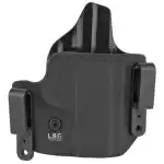 L.A.G. Tactical custom Kydex holster is designed to meet each individual shooter's preference. The holster is extremely comfortable and designed to keep the gun close to the body, making it easy to conceal carry mid to full size gun in a t-shirt without printing. All of Kydex holsters come standard with both IWB and OWB (inside and outside the waistband) belt loops. This allows you to go from concealed to open carry in minutes with one holster. The Defender features easily adjustable retention and is designed to be so comfortable and lightweight. The easily interchangeable belt loops take you seamlessly from your outside the waistband range set up, to your highly concealable inside the waistband daily carry in no time at all. This model is compatible with Smith & Wesson Shield 45.