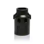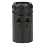 The patent pending design features unique 'through' ports that connect the muzzle brakes vertical vents to the outside atmosphere. This feature allows the brake to function while within the device unlike other system that alter the way the original device works and inevitably remove or massively reduce efficiency. The device also features sets of 'diffuser' grids positioned towards the top of the blast shield that assist in allowing gas to vent upwards as well as forwards at the time of firing, assisting even further in muzzle control.