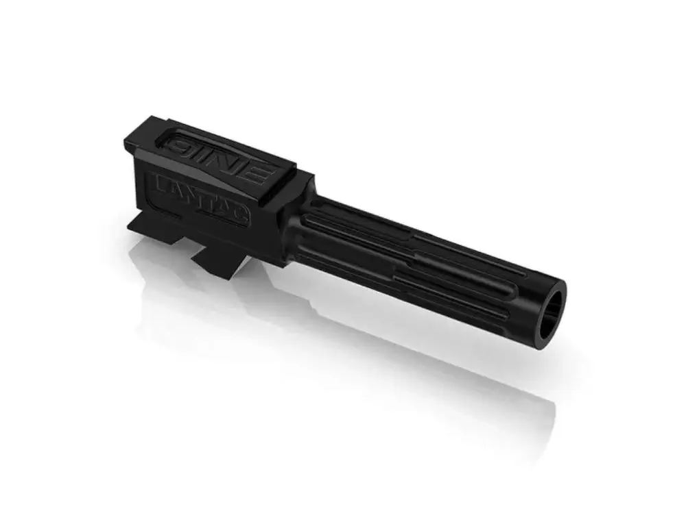 416R stainless steel is renowned for its corrosion resistance, machinability and high tensile strength, it is the industry standard for Match Grade barrel manufacturing.Lantacs machining and production process delivers an ultra-precise barrel with tightened slide fit & lock up for improved accuracy.Our barrels are 6 groove, cut rifled, 1:10 Twist Right Hand, fully inspected, double honed (rough and finish) to produce a bore with a Max Roughness Average (RA) of 12.Chambers are Match Grade SAAMI specification, precision cut and polished to a maximum Roughness Average (RA) of 16.The pre hardened 416R stainless steel is stress relieved to a proprietary recipe after rifling and final hardness is 38-42 Rockwell C before final shaping and profiling work is done.Final dimension are held to a +/- 0.0002" deviation for maximum consistency , accuracy and quality. Barrels are bead blasted to create a satin finish prior to plating and are available in 3 finish options. Stainless Steel, Satin Blast Finish with ultra-smooth hBN (Hexagonal Boron Nitride) Bore & ChamberGold TiN (Titanium Nitride) with ultra smooth hBN (Hexagonal Boron Nitride) Bore & ChamberBlack DLC (Diamond Like Carbon) with ultra smooth hBN (Hexagonal Boron Nitride) Bore & Chamber 9INE Barrels are a drop in fit and do not require gunsmithing for assembly. These are an ultra accurate and extremely tough upgrade to your existing Glock 43 barrel. Barrels are available with and without suppressor threads in 1/2-28 TPI RH. Threaded barrels come with shown thread protector. Barrels are fluted and feature LANTAC's proprietary Patent Pending flute pattern.