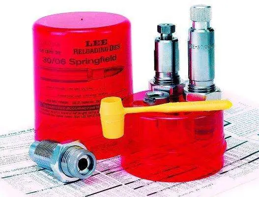Lee's PaceSetter 3-Die Set includes a Full Length Sizing Die, Easy Adjust Dead Length Bullet Seating Die, Factory Crimp Die, Universal Shell Holder, Powder Dipper and instructions/load data.