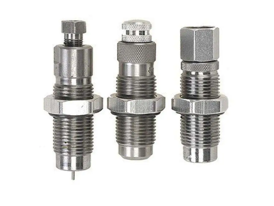 Lee's Steel 3-Die Set for handgun calibers consists of a full-length sizing die (requires case lubrication), bullet seating die, and powder through expander die. It includes a Universal Shell Holder, Powder Dipper, and Instructions/Load Data all packaged in a fitted storage box.