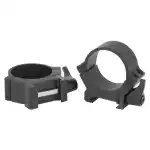 The quick release, weaver style ring mounts features a durable steel construction and a black matte finish. This model has a low ring height and a 30mm ring diameter.