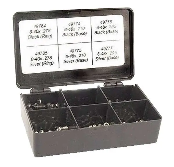 A practical assortment of the most common Torx base and ring screws used in Leupold rings and bases. Packaged in a sectioned black polymer box that is just the right size to pack in any range box.