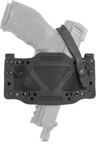 This model has a black finish, and includes a reversible belt clip for OWB or IWB wear, and a secure strap that wraps around the top of the handgun and snaps in place.