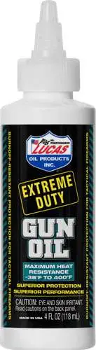 Lucas Extreme Duty Gun Oil is a special blend of oil and petroleum-extracted additives producing a lubrication specially formulated for high volume, high heat and friction firearms. The oil is designed for semi-auto rifles, shotguns and pistols as well as full auto firearms and suppressors. It offers superior burn-off resistance and the polymeric film protects metal from rust, moisture and dramatically reduces wear during all shooting conditions.