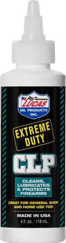 Used and recommended by major firearms manufacturers, Lucas Oil Extreme Duty CLP is designed to clean, lubricate and protect your firearms in one simple step. It contains high grade additives that dissolve powder residue, old lubrication and other contaminates. It penetrates deep into rust to help clean neglected firearms and free rusted parts and actions. Extreme Duty CLP s superior anti-wear additives reduce friction and wear while the unique waterproof, super slick film resists blow out and extends firearm life and runtime.