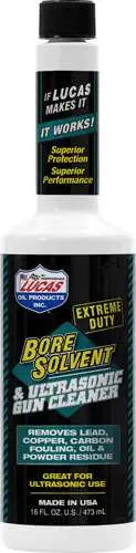Used and recommended by major firearms manufacturers, Lucas Extreme Duty Bore Solvent & Ultrasonic Gun Cleaner is a premium blend of cleaning solvents and corrosion inhibitors. It easily removes carbon and powder residue from actions as well as copper and lead fouling from cylinders and barrels. The solvent based formula cleans deep to remove old oils and grease and provides a micro thin layer of rust and corrosion inhibitor on metal surfaces and bores. It is safe on polymers and factory applied firearm finishes.