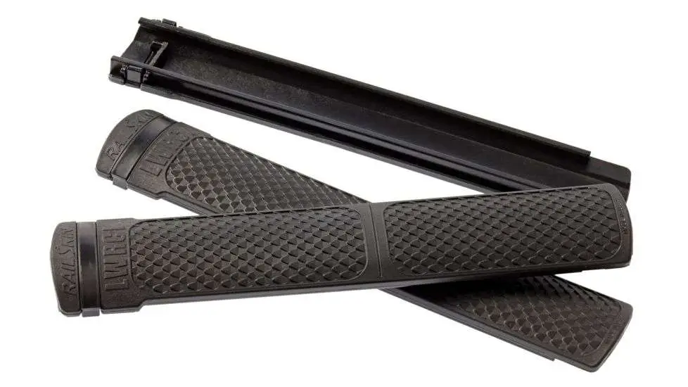 The LWRCI RailSkins rail covers slide easily on Picatinny rails and lock firmly in place. The unique snake scale pattern provides positive non-slip grip even when wet or oily. Made of an extremely durable space-age polymer, they are nearly unbreakable. The heat-resistant properties of this polymer can withstand the harshest of firing while their narrow profile provides for maximum air exchange and cooling of the barrel.