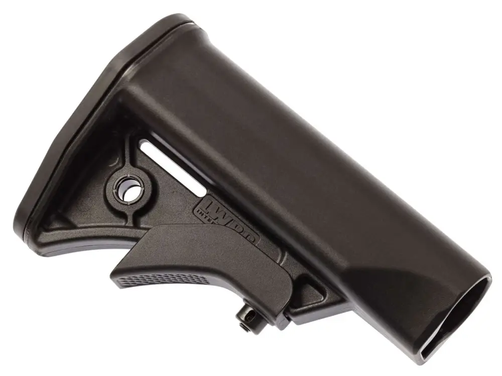 The LWRC International Compact Stock is a drop-in replacement for AR15/M16 carbines with mil-spec diameter buffer tubes. It is a lightweight, no-nonsense stock that features integral sling attachment points, one-handed adjustment, and an excellent cheekweld.