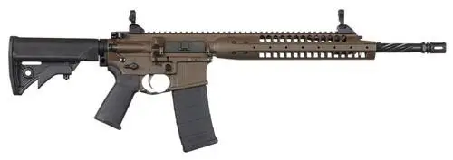 LWRC's IC-A5 is built for high performance and is constructed using the highest quality materials. It is designed with a low profile, 2-position adjustable gas block allowing the shooter to compensate for running a suppressor with the added benefit of a longer modular rail system. The upper rail section is a special cutback version, which allows the use of the low profile gas block and at the same time keep the full 12" modular rails available on the sides and bottom of the hand guards. Its dual control fully ambidextrous lower receiver includes bolt catch and release, magazine release and fire control access from both sides. The cold hammer-forged barrel is NiCorr treated and spiral fluted, while the Nickel-boron coated bolt carrier delivers unparalleled wear resistance, corrosion resistance and permanent lubricity. The IC-A5 comes complete with, LWRCI Skirmish back-up iron sights, an ambidextrous charging handle, LWRCI adjustable compact stock, a Magpul MOE+ grip, and A2 Birdcage flash hider. This model has a 14.7" barrel and a Patriot brown metal finish.