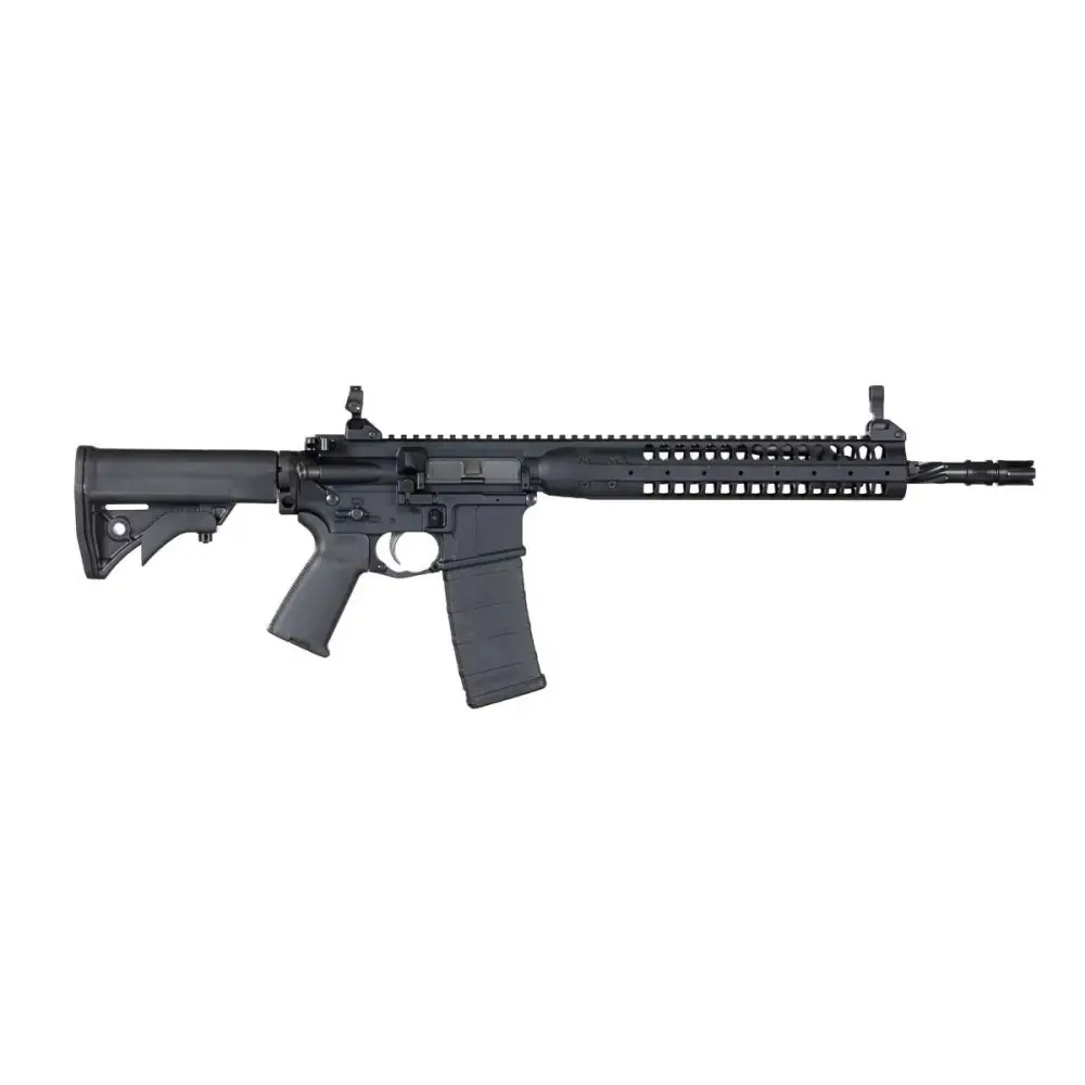 LWRC's IC-SPR is constructed using the highest quality materials. It built on a patented self-regulating short-stroke gas piston system. The one-piece Monoforge upper design includes an integrated rail-base, while the full 12" modular rails available on the sides and bottom of the hand guards. Its dual control fully ambidextrous lower receiver includes bolt catch and release, magazine release and fire control access from both sides. The cold hammer-forged barrel is NiCorr treated and spiral fluted, while the Nickel-boron coated bolt carrier delivers unparalleled wear resistance, corrosion resistance and permanent lubricity. The IC-A5 comes complete with, LWRCI Skirmish back-up iron sights, an ambidextrous charging handle, LWRCI adjustable compact stock, a Magpul MOE+ grip, and a 4-prong flash hider. This model has a 16.1" barrel and a black metal finish.