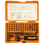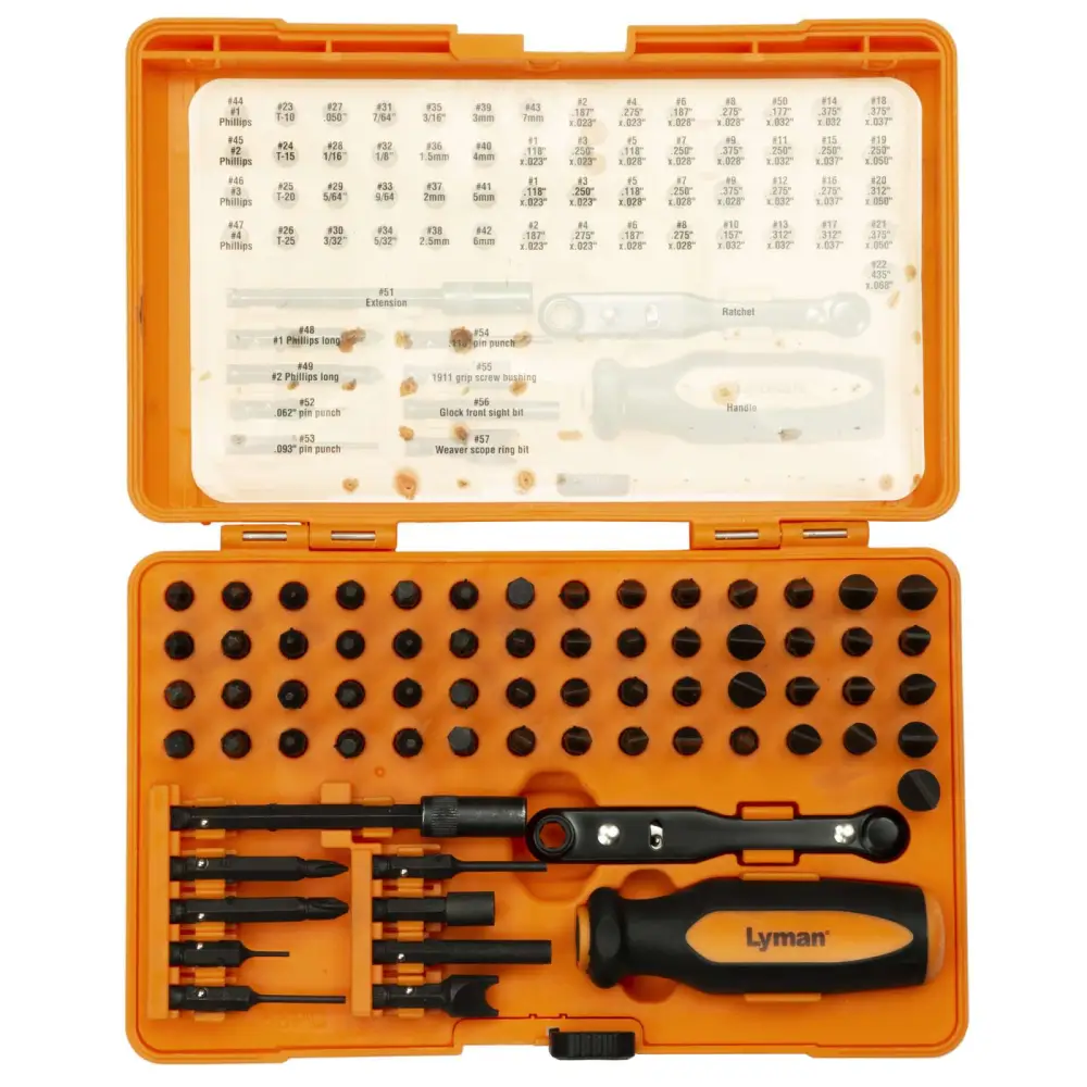 Lyman's screwdriver sets provide all the bits needed by gunsmiths and all those who work on firearms. These complete sets come with bits for slotted screws, hex screws, 6-lobe screws, and Phillips screws; in addition to an assortment of specialty bits. The specialty bits include a Weaver scope ring bit, Glock front sight bit, 1911 grip bushing bit, as well as .062", .093" and .118" pin punches. The sets also include a ratchet wrench so the maximum torque can be applied to those tough-to-remove screws. This 68-piece kit is packed in compact, convenient storage case.