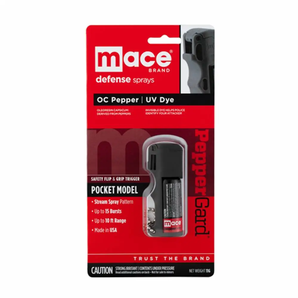 Mace PepperGard is there signature Flip & Grip Pepper Spray to keep in a pocket, purse, backpack, or with keys. The flip-top safety cap prevents accidental discharge while the finger grip dispenser makes it easy to aim.