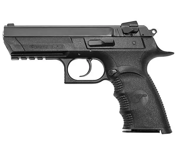 The Baby Eagle 3 is a 9mm caliber double/single action pistol. This handgun features a 4.43 inch barrel along with a polymer frame and a carbon steel slide finished with a black oxide coating. It also features a combat type 3-dot sight set up and two 10 round magazines.