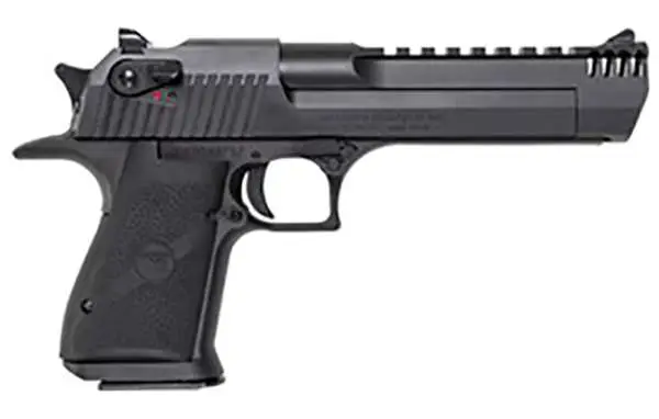 Magnum Research's Desert Eagle Mark XIX 44 Rem Magnum is a rotating bolt, semi-automatic pistol with a black finish. It is construction of the latest CNC machine technology providing exacting specifications with tight tolerances creating a work of art in a precision firearm. This Desert Eagle features a Weaver style accessory rail that easily allows for aftermarket optics and scope rings, and an integral muzzle break.