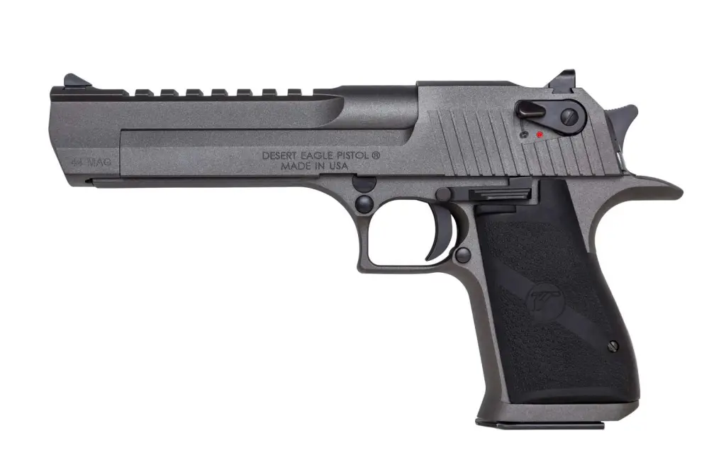 This model is a 44 Remington Magnum with an ambidextrous safety, 8-round magazine, and dark graphite gray Tungsten Cerakote metal finish with black appointments.