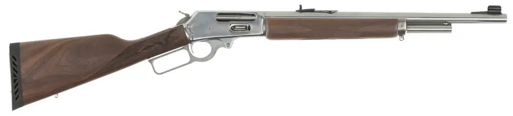 The hunter who's looking for plenty of power in a compact, stow-anywhere package will find the ideal solution in the model 1895GS. This lever action 45/70 carbine that can take on any kind of game can also take on any kind of weather. Its receiver, barrel and all major metal parts are machined from stainless steel, and most other metal parts are nickel-plated. The stock is American black walnut with cut checkering.