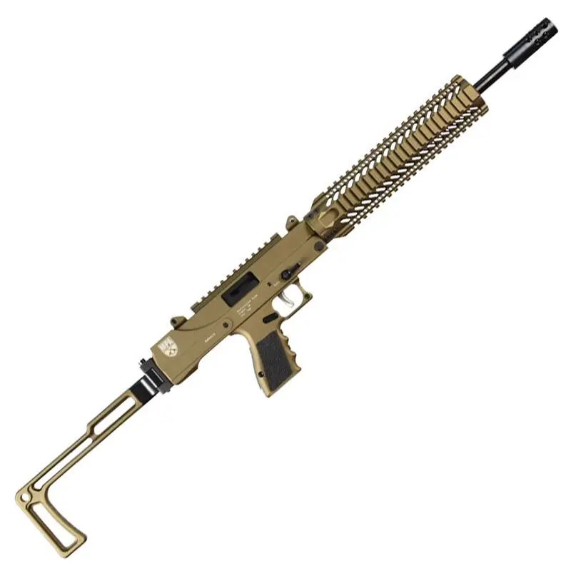 This 9mm Defender Carbine Rifle is based on the 930DMG Pistol. The ergonomically designed grip system incorporates a Solidworks designed profile, with a low profile magazine release and decal grip panels. Its lower is machined from aircraft grade aluminum, provides cleaner lines and is lighter weight. The handguard is produced from an aluminum extrusion which has no fasteners, and is free floating. Includes additional upgraded features such as adjustable front and rear sights, plus Cerakote burnt bronze coating.