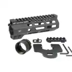 Made in USA, the Combat M-Lok Handguard is constructed of 6061 aluminum with a continuous 1913 Picatinny top rail, two integral anti-rotation QD sling sockets, and seven sides of M-Lok. It also utilizes a 4140 heat treated barrel nut, 4140 heat treated torque plate, and is fully dehorned and deburred. The handguard includes a barrel nut, wrench, and 5-Slot polymer M-Lok rail.