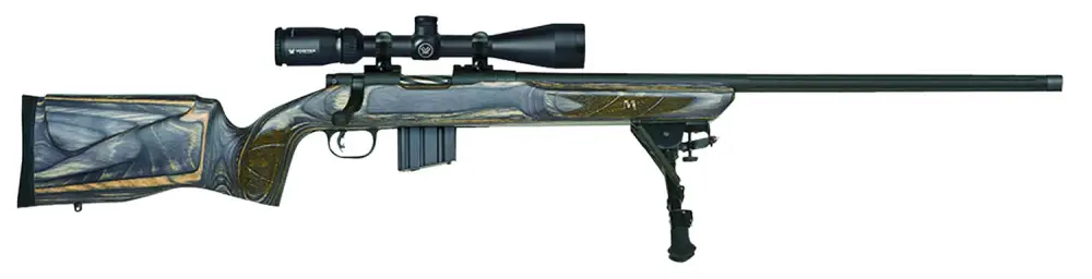 The MVP Varmint features a benchrest laminate stock, a 24" medium bull barrel, and a 4-16x50mm scope. It also features a LBA trigger.