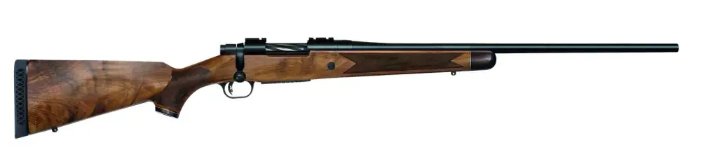 The classically-styled Mossberg Patriot looks great on the gun rack and feels great when shouldered. Attractive, accurate and affordable, this bolt-action rifle comes standard with Mossberg's patented LBA trigger, user adjustable from 2 to 7 lbs. The spiral fluted bolt with a knurled handle offer plenty of grip for quick follow-up shots and enhanced shooter comfort, and its box-magazine-fed action makes loading and unloading a snap. The Patriot's button-rifled, free-floated barrels have a recessed crown for maximum accuracy. Patriot Revere models feature a Premier 2.0 Grade European walnut stock with an oil finish, fine line checkering, and rosewood forend tip and grip cap, both with a stylish contrasting maple spacer accent for a distinctive, high-end look. A Mossberg monogrammed "M" proudly adorns the cap. It has a 24" blued barrel with Weaver style bases.
