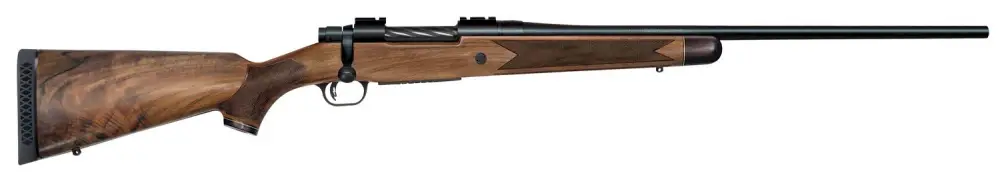 The classically-styled Mossberg Patriot looks great on the gun rack and feels great when shouldered. Attractive, accurate and affordable, this bolt-action rifle comes standard with Mossberg's patented LBA trigger, user adjustable from 2 to 7 lbs. The spiral fluted bolt with a knurled handle offer plenty of grip for quick follow-up shots and enhanced shooter comfort, and its box-magazine-fed action makes loading and unloading a snap. The Patriot's button-rifled, free-floated barrels have a recessed crown for maximum accuracy. Patriot Revere models feature a Premier 2.0 Grade European walnut stock with an oil finish, fine line checkering, and rosewood forend tip and grip cap, both with a stylish contrasting maple spacer accent for a distinctive, high-end look. A Mossberg monogrammed "M" proudly adorns the cap. It has a 24" blued barrel with Weaver style bases.