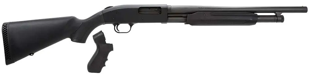 The Mossberg 500 Special Purpose shotgun is a low-maintenance pump action shotgun perfect for security needs. This model utilizes an aluminum alloy receiver and twin action bars for smooth and reliable operation, and the barrel is fully interchangeable. The Mossberg 500 Special Purpose features an easily-manipulated, top-of-receiver-mounted safety, an anti-jam elevator, and dual extractors. This model features a pistol grip kit and Parkerized finish.
