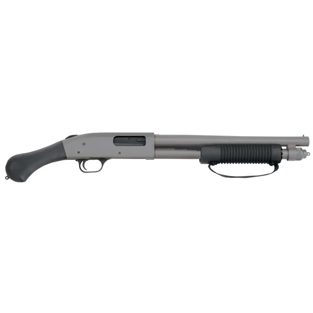 The 590 Shockwave Raptor bird's head pistol grip is uniquely shaped to minimize felt recoil. Classified as fully-compliant by the BATFE, this model has a 26.37" OAL. The 590 Shockwave features a convenient clean-out tube magazine cap, a front bead sight, and 'corn cob' strapped forend to keep shooter's lead hand clear of the muzzle. It has a 14.375" heavy-walled barrel with a cylinder bore and a stainless steel cerakote metal finish.