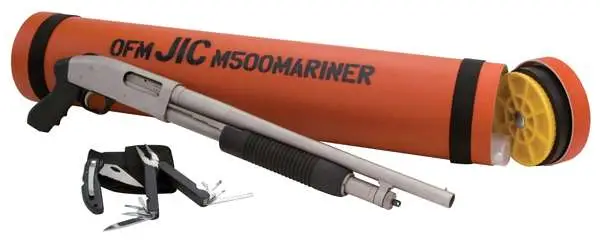The heart of the JIC package is the venerable 12 gauge Mossberg 500 pump action. Fitted with a compact 18.5" barrel and rugged synthetic pistol grip and forearm, the JIC Mariner features Mossberg's proprietary Marinecote finish for employment in or around harsh marine environments. It is packaged in an International Orange water-resistant carrying tube with a nylon carrying strap and a resealable plastic storage pouch. The JIC Mariner also comes with a durable multi-tool and serrated lock back knife combo pack with cordura case.