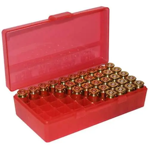 MTM's P-50 series features a flip-top lid and is molded to hold 50 rounds of ammo in a neat 5x10 grid. These ammo boxes have a textured surface for gripping and a grooved lid designed to for easy stacking. Choose from five sizes in multiple colors. Each box is supplied with a load label for at-a-glance organization.