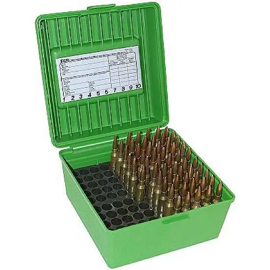 This Deluxe R-100 box stores and protects 100 rounds of rifle ammunition. It comes with an inner tray for two height positions to fit more cartridge lengths. Bullets can be stored up or down for most calibers, and when in the down position, rounds are protected from tip damage. It has a folding handle and are made from virtually indestructible polypropylene with a scuff-resistant, textured finished that will not crack, ship, contract, expand or warp along with MTM's integrated 'living' hinge and a Snap-Lok latch.