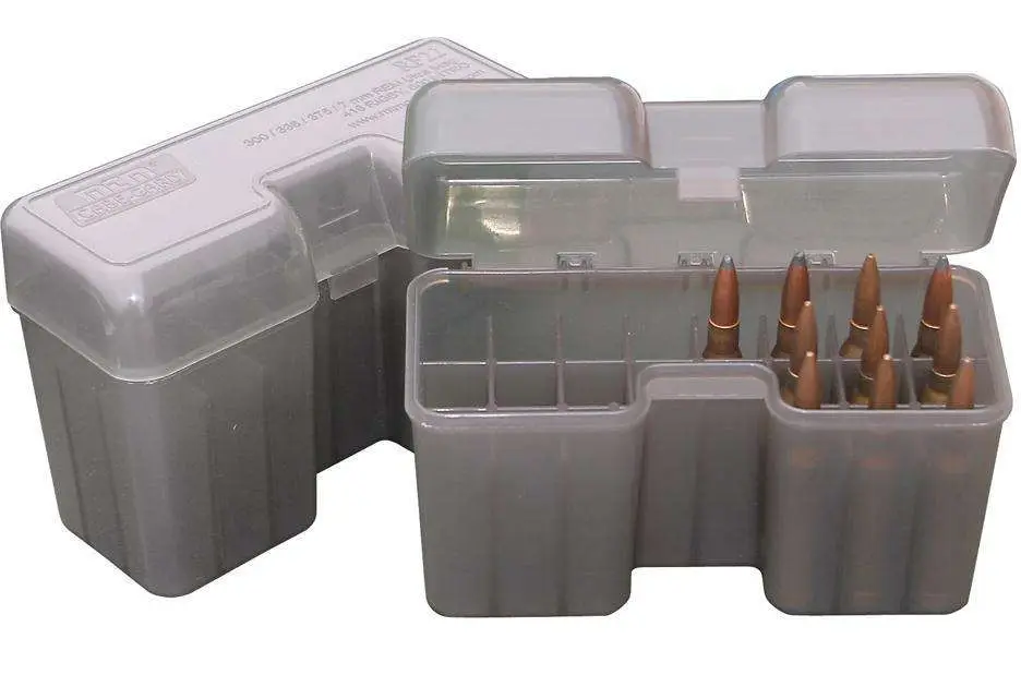 MTM's rifle ammo boxes feature a flip-top with rounded edges are made of polypropylene plastic that will not warp, crack, chip , peel, expand or contract. Designed for the short magnum and large ultra magnum rifle calibers, they hold 22 rounds.