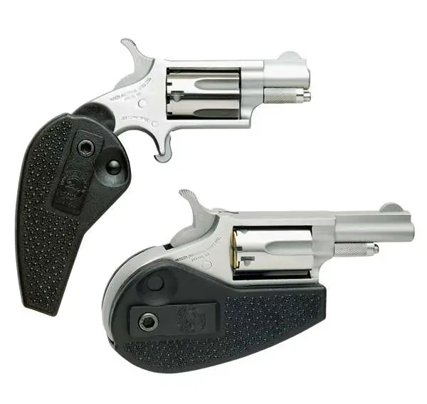 This patented holster grip is an excellent accessory for a mini-revolver on NAA's Long Rifle frame. Your mini-revolver will fit snugly into this holster grip, which unfolds and locks to become the handle of the gun. By depressing the release button, the revolver folds back into the grip. The holster grip gives the shooter better control and provides an additional safety feature when folded because it completely encases the trigger making it virtually impossible for the gun to be fired. It has an ambidextrous belt clip.