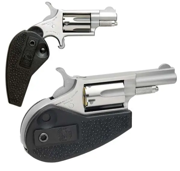 The Mini-Revolver series by North American Arms offers a lightweight concealed carry pocket gun with a 5-shot capacity. Using the half-way notch cylinder, the hammer may rest safely and securely away from live or empty chambers without chance of accidental discharge. The steel frame is fitted with a handy locking black holster grip with a pocket clip and fixed blade front sight. The holster grip unfolds and locks to become the handle of the gun. Press the release button and the mini-revolver folds back into the grip. For added safety, when the holster grip is folded, the trigger of the gun is completely enclosed making it virtually impossible for the gun to be fired.