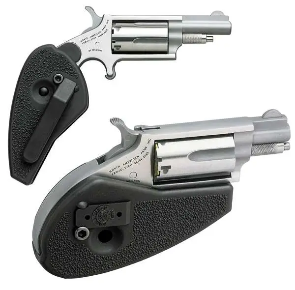 The Mini-Revolver series by North American Arms offers a lightweight concealed carry pocket gun with a 5-shot capacity. Using the half-way notch cylinder, the hammer may rest safely and securely away from live or empty chambers without chance of accidental discharge. The steel frame is fitted with a handy locking black holster grip with a pocket clip and fixed blade front sight. The holster grip unfolds and locks to become the handle of the gun. Press the release button and the mini-revolver folds back into the grip. For added safety, when the holster grip is folded, the trigger of the gun is completely enclosed making it virtually impossible for the gun to be fired.