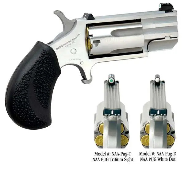 Squat and sturdy like it's namesake dog, the NAA Pug is chambered in 22 Magnum, sports a 1" barrel and is just 2.75" tall. This stocky companion will deliver a bite even worse than his bark from the 5-shot cylinder. Featuring a slightly over-sized pebble-textured rubber grip enables the handler to keep a firm "leash" on this pocket-size puppy. Using the half-way notch cylinder, the hammer may rest safely and securely away from live or empty chambers without chance of accidental discharge.