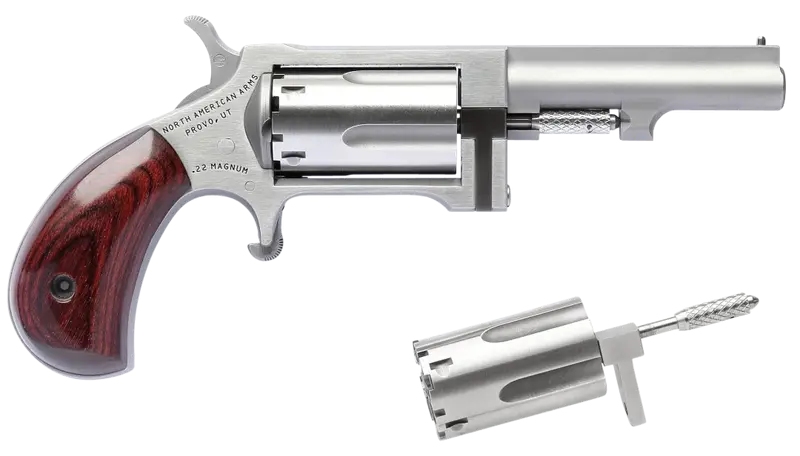 The Sidewinder from North American Arms is a single action 22 Magnum revolver with a 5-round capacity. It features a 2.5" barrel with a half moon fixed front sight and rosewood grip. This conversion model includes a 5-round 22 Long Rifle cylinder.