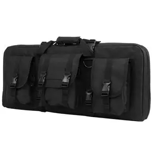 Deluxe SubGun double Pistol Carbine case allows for two AR & AK pistols, subguns, AOW or folding carbines to be transported within the padded main compartment with a padded divider to prevent weapons from contacting each other. Additional storage pouches to store mags or other gear. Each compartment has two diagonal side pocked to help secure each end of the firearm and two hook and loop straps to secure each firearm inside the case.The three large exterior pockets (2 each 7"H X 5"W and one 7"H X 7"W) to store your magazines and additional gear. Pocket flaps secure via plastic quick connect buckles, hook and loop fasteners and bungee cords help secure your gear in place. Two compression straps with plastic quick connect buckle on the top and bottom of the case to help secure your firearm and gears in place. Large Heavy Duty zippers on the main compartment with lockable metal zipper pulls. Heavy Duty padded carry handles. Adjustable shoulder strap attaches to large metal D-Rings. Case is made from heavy duty PVC material that is water and chemical resistant.