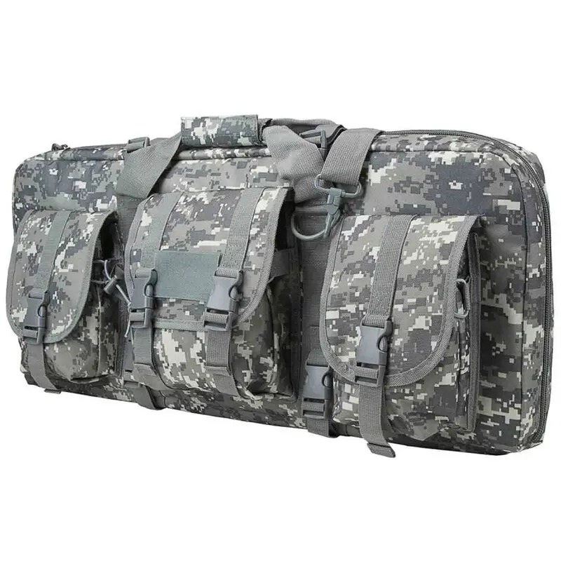 Deluxe SubGun double Pistol Carbine case allows for two AR & AK pistols, subguns, AOW or folding carbines to be transported within the padded main compartment with a padded divider to prevent weapons from contacting each other. Additional storage pouches to store mags or other gear. Each compartment has two diagonal side pocked to help secure each end of the firearm and two hook and loop straps to secure each firearm inside the case.The three large exterior pockets (2 each 7"H X 5"W and one 7"H X 7"W) to store your magazines and additional gear. Pocket flaps secure via plastic quick connect buckles, hook and loop fasteners and bungee cords help secure your gear in place. Two compression straps with plastic quick connect buckle on the top and bottom of the case to help secure your firearm and gears in place. Large Heavy Duty zippers on the main compartment with lockable metal zipper pulls. Heavy Duty padded carry handles. Adjustable shoulder strap attaches to large metal D-Rings. Case is made from heavy duty PVC material that is water and chemical resistant.