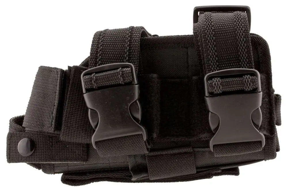 This holster is a composite design with tough PVC outer fabric with a stiff plastic insert between the fabric layers to hold the holsters shape and has a quilted sewing design to make this a very durable and stiff holster design. It features an adjustable Thumb Snap to secure your pistol in the holster, a single Magazine Pouch on the front edge of the holster, two adjustable slip resistant Thigh Straps with Quick Release Buckle, adjustable for height Drop Leg Strap with Quick Connect Buckle, and dual Belt Loops with thumb snaps.The holster belt attachment has two nylon loops with thumb snaps for ease and quick attachment to your belt. Its drop leg strap is adjustable for drop via hook and loop fasteners.