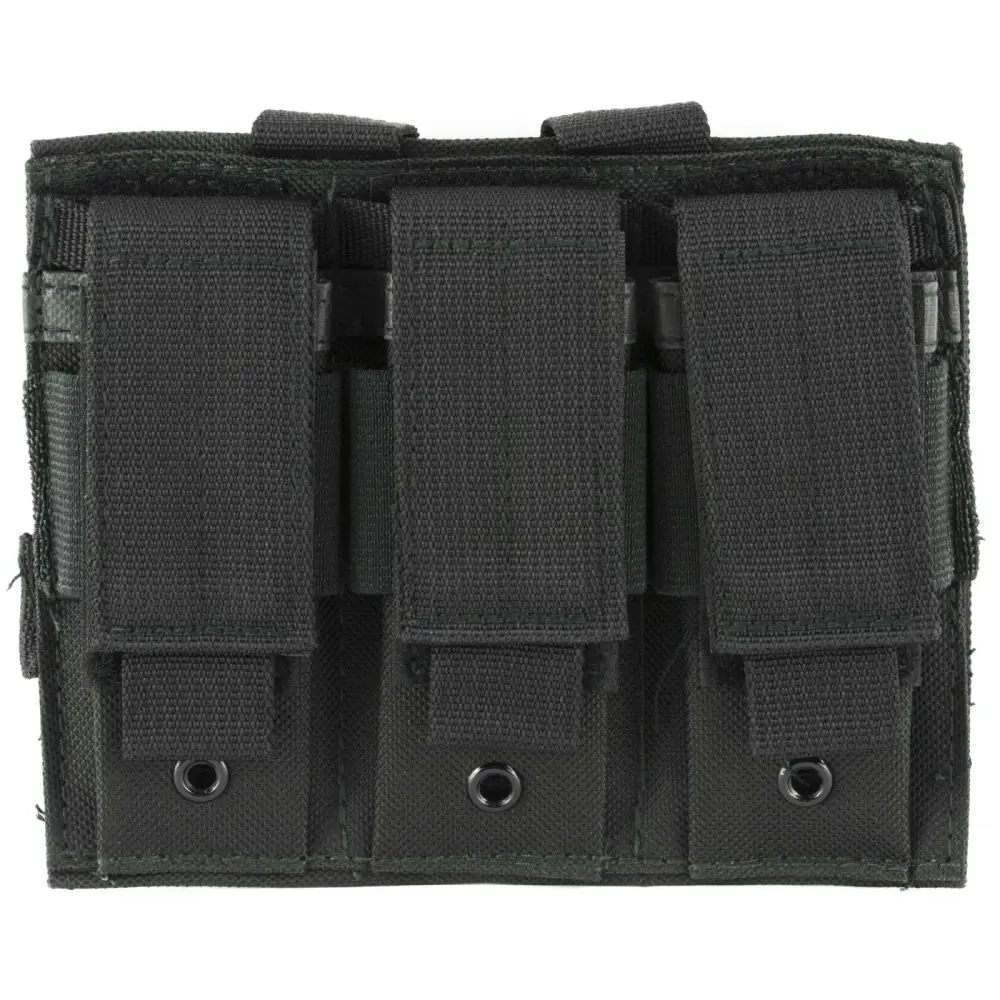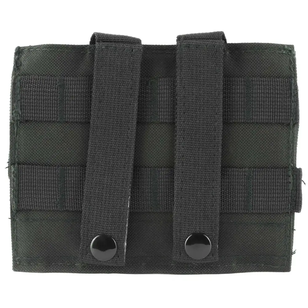 This mag pouch features three compartments to fit double stack pistol magazines, 2 snap buttons, and Molle webbing on the back panel for flexible mounting.
