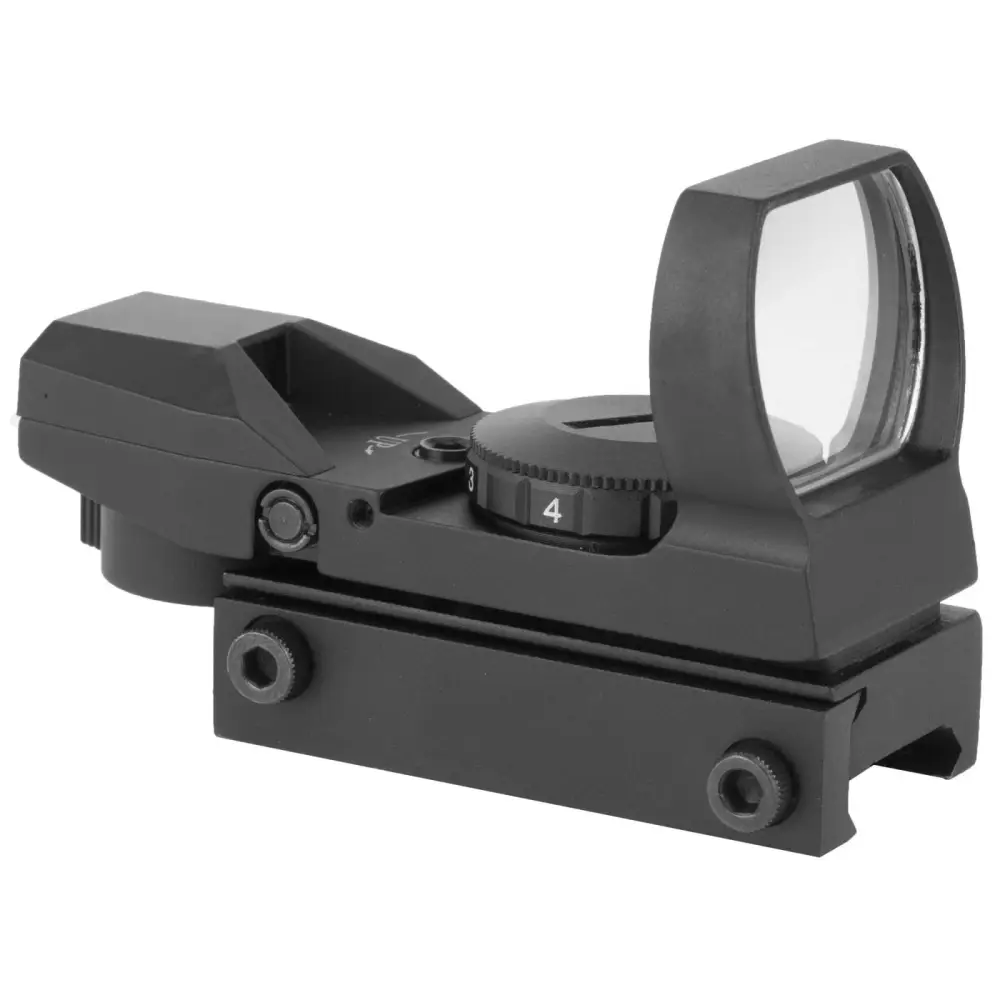 The Red Four Reticle Reflex Optic by NcStar features reticle choices of dot, bullseye, cross, and starburst. The LED is 100% safe for the eyes, and there is unlimited eye relief for flexible mounting. The rheostat knob allows the user to choose from 7 brightness settings, and the optic is powered by one 3V lithium battery (CR2032 or equivalent). This optic features a black anodized aluminum body, a rubber lens cover, and a built-in Weaver-type mount for installation on Weaver or Picatinny-type rails.