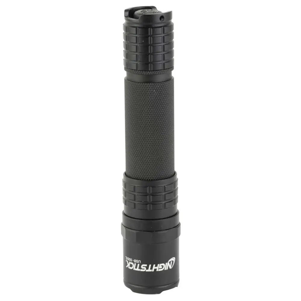 The USB-558XL Rechargeable Tactical Flashlight is multi-functional, cycling between high, medium and low modes with an optional strobe when you press twice in succession. It uses a CREE LED rated at 900 lumens on high for 2 hours but can be extended up to 16.75 hours in low mode (100 lumens). The USB-558XL is rated IP-X7 waterproof, chemical, heat and impact resistant and features a discretely sleeved collar that opens for direct USB charging. The built-in charging indicator turns from red to green when fully charged. The flashlight can also run on 2 CR123 batteries for back up power. The flashlight is serialized for personal identification. Comes with a 2' USB charging cable, lithium-ion rechargeable battery and CR123 battery carrier (batteries not included).