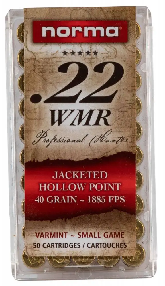 This Norma load features a jacket hollow point with a 40 grain weight. It comes packaged 50 rounds per box, 40 boxes per case.