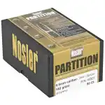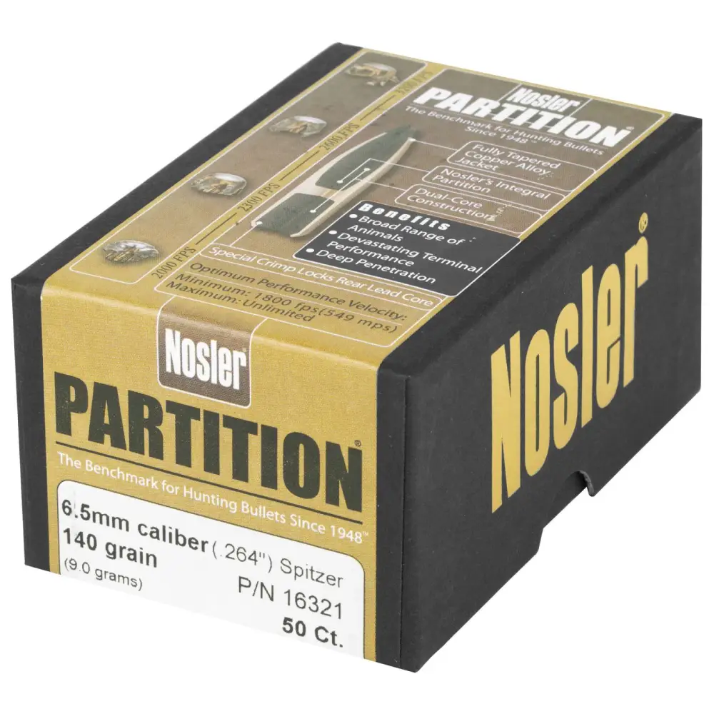 Every Partition bullet in the Nosler line is engineered with an optimum length, weight and ogive design for maximum in-flight and terminal performance. The fully tapered copper-alloy jacket ruptures instantly at the thin mouth, yet the gradual thickening along the bullet's axis controls expansion and curls the jacket uniformly outward at high and low velocities. Nosler's integral partition supports the expanded mushroom and retains the rear lead alloy core. Enclosed rear core retains more than half the original bullet weight for deep penetration. Special crimp locks add strength to resist deformation under the pressure of heavy magnums.