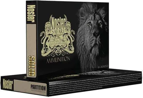 Nosler Safari Ammunition. Loaded with either the Partition or Nosler Solid and designed for the same point of impact with either bullet, Nosler Safari Ammunition provides the ultimate versatility for any dangerous game situation.