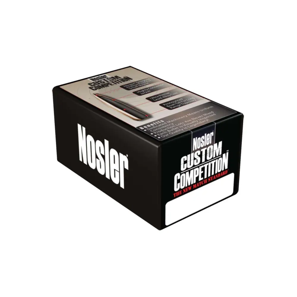 Nosler has blended the accuracy of its Custom Competition bullet jackets with its own ultra-precise, form-fitted lead-alloy cores to create the performance standard for match rifle and pistol bullets. The hollow point provides a small meplat for reduced drag and increased aerodynamic efficiency while the pronounced boattail design provides efficient flight characteristics over a wide range of velocities. Highly concentric jackets, ultra precise lead alloy cores and hand inspected quality offer competitive shooters more or less.