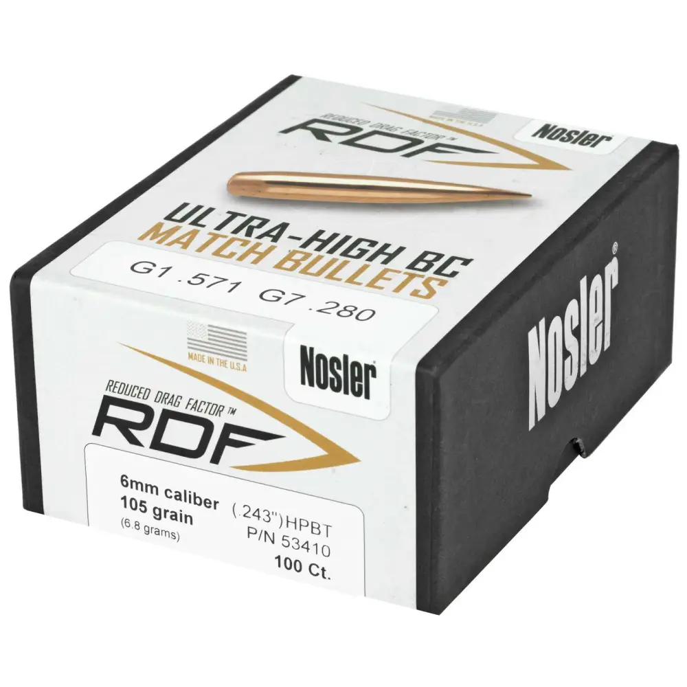 For those wanting to squeeze the most performance from their competition rifle, Nosler's RDF (Reduced Drag Factor) match bullet line is the ideal choice. The RDF line was designed from the ground up to provide exceptionally high BCs, which create the flattest trajectory and least wind drift possible. The keys to the RDF's outstanding performance are Nosler's meticulously optimized compound ogive and long, drag-reducing boattail, which make handloading a snap and create an incredibly sleek form factor. RDF bullets also have the smallest, most consistent meplats of any hollow point match bullet line, so there is no need to point or trim tips.